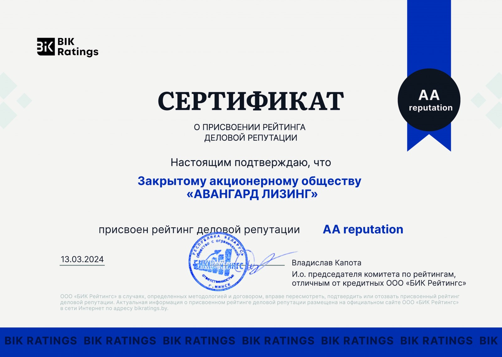 Рейтинговое агентство BIK Ratings 13 марта 2024 года пересмотрело рейтинг деловой репутации ЗАО «АВАНГАРД ЛИЗИНГ» и подтвердило его на уровне AA reputation, который характеризует деловую репутацию высокого уровня.